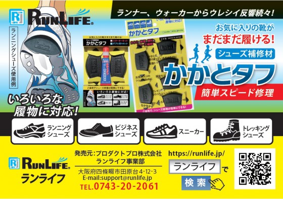 ランナーの強い味方、ランニングシューズのかかと修理で便利な「かかとタフ」をはじめ、有名メーカー ランニングウエア、ソックス、小物、かわいいゼッケン留め「ピーホック」、日本人の味覚に合ったランニング携行食品「ハニーアクション」、