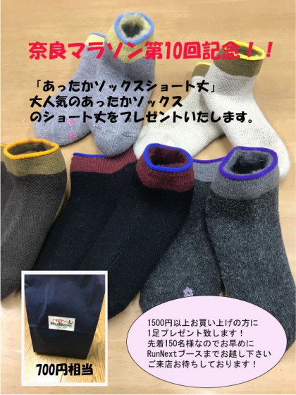 今年は奈良マラソン限定オリジナルソックス以外にも奈良マラソン第10回を記念してお買い上げのお客様にプレゼントをご用意しています!